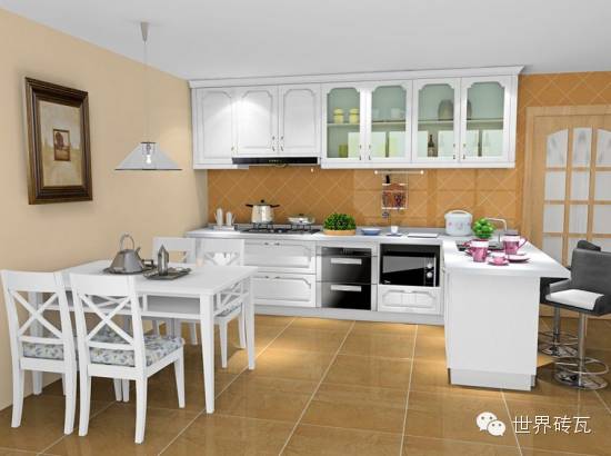 因为厨房间有很多橱柜,橱柜的背面不应当铺贴瓷砖,因为在这样完全被橱柜遮挡的地方铺贴瓷砖完全是一种浪费。