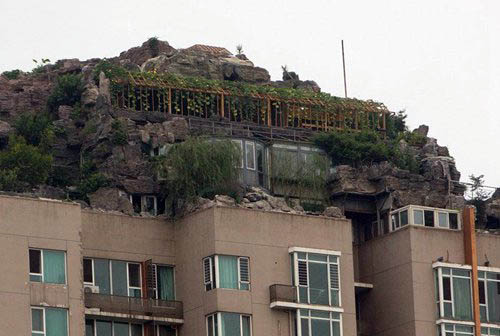 位于北京市城区西部的某小区,一栋26层居民楼顶层竟然加盖了假山亭台,形成面积约1000平方米、高为2层楼的建筑群。北京市海淀区城管大队12日表示,经过认定,该建筑属于违法建设,已上报至北京市规划委员会;即便无法确定建筑物的建设人、所有人和管理人,但可以进行公示,并将履行法律程序,对违法建设予以拆除。