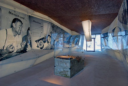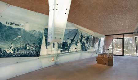 博物馆南侧整体镶嵌了玻璃,上面丝毫未加修饰,门框也选择最低调深沉的黑色,整体感觉通透,山脉白雪倒映在玻璃上时,内外交相呼应,博物馆浑然就是自然最真实的反映。这种造型看上去也很像一个望远镜,代表着人们对自然的探索,当然,也可以当成一个观光点,站在这里可以看到山脉间冰川遗留下来的痕迹。博物馆内部从地板到天花板间都镶嵌了玻璃,冰冷的触觉和白色的底色给人“冰穴”的体验,冰穴内延续建筑外部的不规则几何造型,不同玻璃不同形状,冷色调中印着大幅描绘山道开拓者的故事和辉煌成绩的图片向先驱者表示敬意。通过图片附注简单明了的介绍,参观者可以了解高山公路建成的历史。房间正中还特地设置一个玻璃罩,郑重地摆放着阿尔卑斯高山公路的模型。在屋顶矩形的立体吊灯照明下,反映着人类征服自然的勇气和成果。