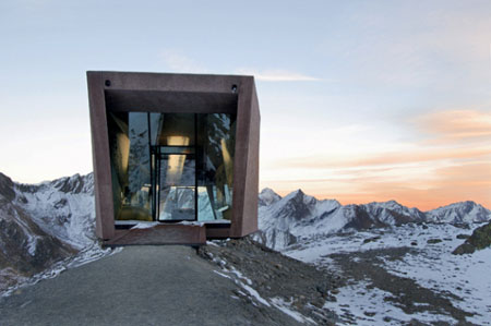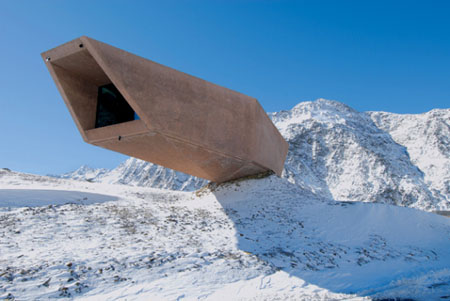 Timmelsjoch体验博物馆在蒂默尔北面新的路边向空中伸出,整个建筑只有一侧底部固定在山石之间,看起来极不牢靠,但实际上稳如磐石。