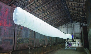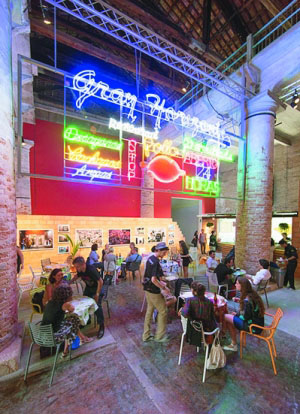 平心而论,这次中国馆的五件作品水准并不错,失败的原因似乎就在于今年组委会不钟情抽象与思辨,而是对具体现实项目的展示更感兴趣。其中建筑师邵韦平的“序列”是一组横跨中国馆上部的长达22米的白色圆形装置,以切片的方式,把一个基于莫比乌斯圈的原理而做的建筑设计概念模型做线性的展开,将其原本由纸片首尾扭转半周后相接的圆环切开拉长。这也是对其作品凤凰卫视大楼创作理念的一次追溯。建筑师王昀的装置“方庭”则由36个白色和镜面方体的矩阵组合成正方形的庭院。来自湖南长沙的建筑师魏春雨的“异化”,是通过物体的变异来体验时空的变化——一个长方形的桶,被截成多段,从最开始的突兀的岩石到最后光洁的不锈钢,用各种材质表现人类初始的材质和当今材质之间的延续、关联和断裂。
