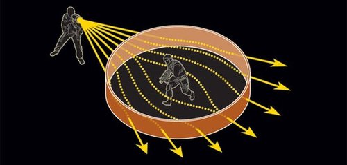 如何工作:作为一次测试,研究人员们把斗篷放在一个平整的表面上并在中间留下了一个隆起。斗篷弯曲了隆起附近的照射光线并且把光线反射回来就好像光线照射在了一个平面上。观察者从来都不知道隆起的存在。