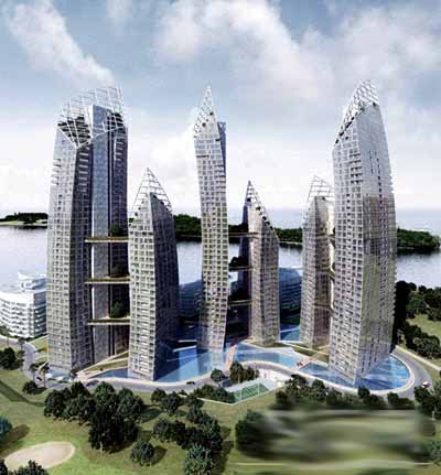 建筑呈现出惊人的倾斜状,外观光滑、弯曲,而建筑又非常高,因此建筑上层之间的间隙特别大。建筑细节的设计都是为了增加人与大海和风景之间的距离,建筑群更是被周围茂密的树林所环绕。这个项目由于节能环保,已经获得了新加坡的GMGA(Green Mark Gold Award)。