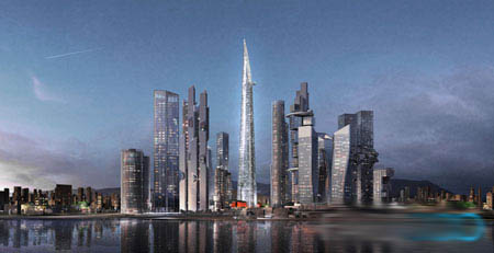 商务区内有20座标志性建筑,其中有伦佐•皮亚诺设计的一座620米高的尖塔,目前的名字就叫“地标大厦”(Landmark Tower)。闪闪发光的灯塔式的大厦有着直径76米的基座,而顶部是一个22米宽的尖刺,直插云霄。如果现在建成,它将是继哈里发塔后的世界第二高楼。