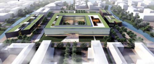 新校区图书馆位于新校区东西主轴线上,是校园核心岛的中心,与未来的第一教学楼和信息网络中心共同构成校园的核心公共建筑群。图书馆用地西侧为校区的公共景观绿地,且面朝远处的校园景观湖;东侧为沿校区主轴线两侧布置的教学实验楼组团;南北侧均为教学楼群。设计方案从校园空间的特色出发,借鉴中国传统建筑中以“庭院”为中心的空间组织模式,力求营造一个现代校园精神中所强调的公共性与开放性的内聚型书院文化精神场所。