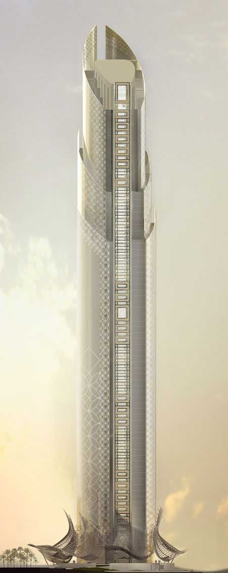 这座大厦是由Innovarchi事务所设计的,灵感来自于悉尼奥运会的火炬和澳大利亚黄金海岸的Q1大厦。为了强调层级玻璃幕墙的光滑,Innovarchi还重新设计了立面。如同玫瑰的花瓣,主立面被制作成一系列精致的层面,保护大厦不受恶劣气候的侵袭。