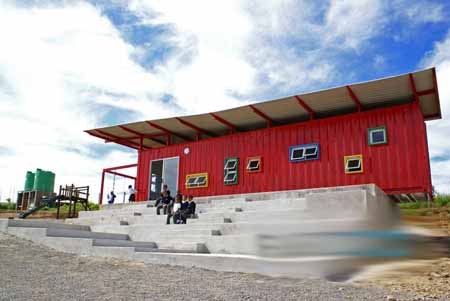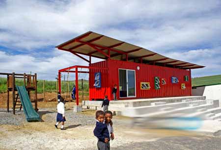在南非开普敦风景如画的郊区Durbanville葡萄谷,集装箱搭建的Vissershok小学教室开始投入使用。这里的学生大多是农庄工人的孩子或是几公里外贫困社区Du Noon的孩子。该项目得到了三家南非公司的资助:Woolworths、Safmarine和AfriSam。回收的12米长的集装箱改造成一座独立的教室后,可容纳25名年纪在5到6岁的小学生。