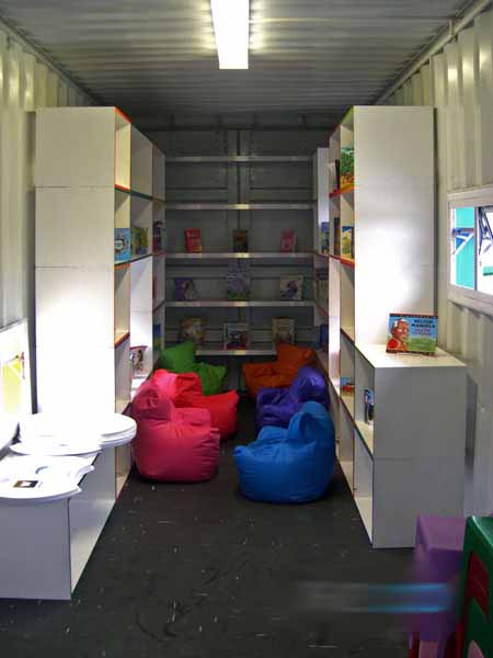 • 学习区:早上是教室,下午可变为小型图书室。大块屋顶遮挡住直接的光照,集装箱两侧色彩丰富的窗户实现了自然交叉通风;