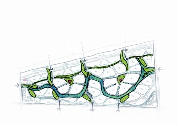 在约翰·保林的构想中,中信公园城通过一条主干河流和很多支流分成若干的地块,规划出不同的地块形态,有河湾形成的洲陆,有半岛,也有模仿河流冲击形成的三角洲地形。这样做的好处不仅保证了社区大盘的整体性,更形成居住的多样化地块,在建筑设计中可以沿着地块的脉络创造更多的建筑搭配,丰富社区的空间结构。