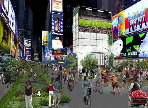方案也将时代广场作为生产枢纽,将明亮的街灯、剧院同人行区域相结合。太阳能板在收集能量的同时也提供荫蔽。城市农作物沿人行区域排布,果树为行人提供了荫蔽。同时代广场巨大的广告牌相呼应的是,一座巨大的生长塔设置了巨大的LCD屏放映广告。方案同时预见到了冬天遍地斑块状的农场,冬天的食物生长细胞和肉类生产塔以提供肉类。