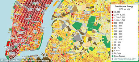 今天研究人员用一幅地图展示了五个行政区里每个建筑的能源使用情况。