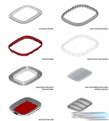 这座建筑没有采用通常的钢混结构,而是纯粹的钢构,分为三个独立的部分,即薄膜立面、模块化的场馆本身以及内部屋顶。为了在仅仅几个月时间内搭建出一座足 球场规模的场馆,设计和施工同步进行。设计组和施工公司通力合作,借助丰富的经验和管理手段实现了这一目的。